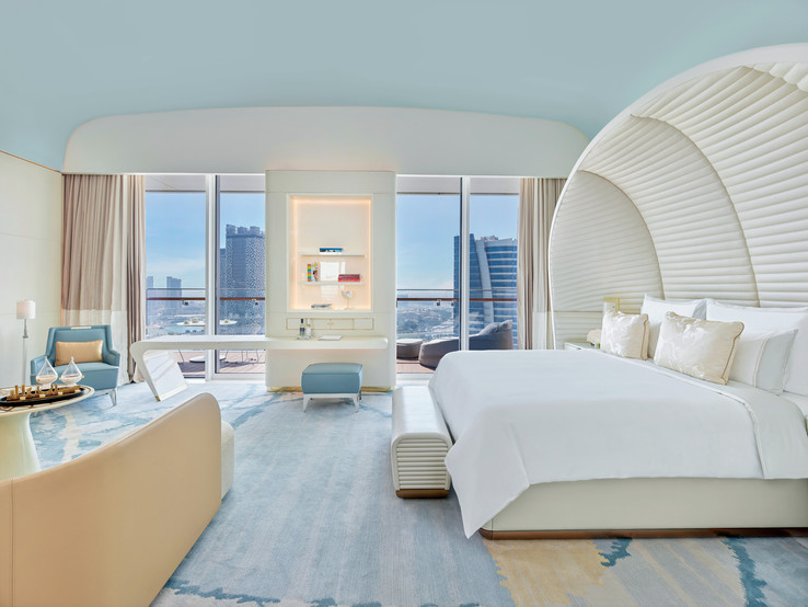 The luxurious five-star Fairmont Doha contains 270 rooms, 92 suites, 4 themed suites and 1 presidential suite, all inspired by the interiors of luxury mega yachts. With gold mosaic wall tiling, the rooms present an outstanding visual spectacle with rounded and curved walls.