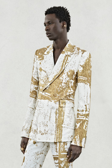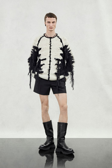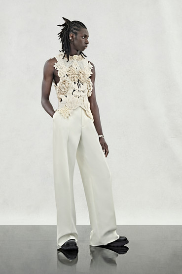 Clothing is knotted around the body – apparently seamless. Ceremonial embroidery and soft appliquéd harnessing are inspired by archive McQueen; threedimensional hand-crocheted knit and chiaroscuro flowers inspired by Dutch Old Master paintings. An abstract fold print, developed by long-time McQueen collaborator, Simon Ungless, extends into jacquards and embroideries, wrapping the body – the anatomy – within