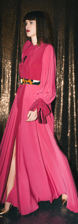 With an omnipresent cotemporary touch, the statement looks that can be distinctively related to that era revolve around exaggerated capes, sexy high slits, dancing skirts, flared pant jumpsuits, oversized sleeves, and effortless shirtdresses.