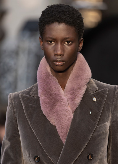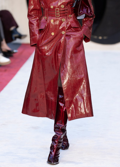 rich hand of leather, metallics and knitwear with lashings of lace creating a heightened sense of everyday, everywhere feel-good drama. Exquisitely crafted tailoring evokes an entrepreneurial spirit, an ambitious mood matched by the après-ski aesthetic that takes its cue from the timeless alpine glamour of icons of the silver screen. Statement outerwear includes oversized faux fur coatsand puffers quilted in archival diamond matelassé which serve as a highlight.