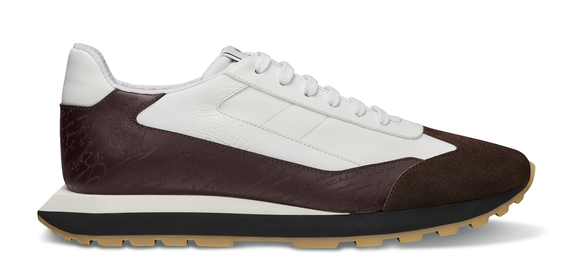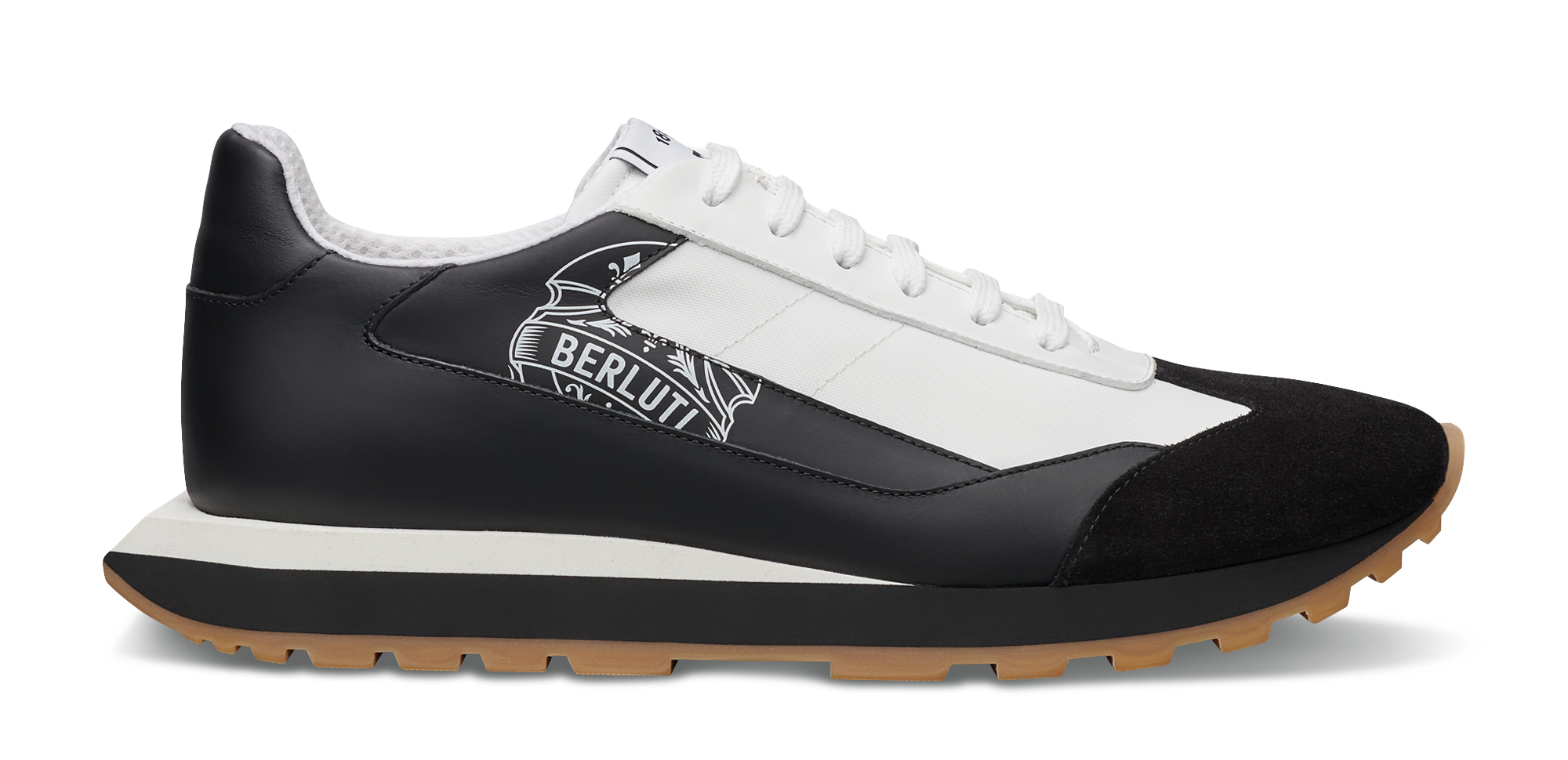 Three different versions are available: a minimal white with a contrasted black Berluti crest print, a black and white, and a brown and white complete with embossed Scritto details and a discreet tonal rendering of the Berluti crest.