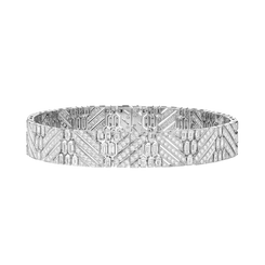 More than a jewel, this white gold ribbon set with baguette and round diamonds is the ideal genderless accessory. With its chevron pattern, iconic of Art Déco, this graphic line can equally be a belt worn by a man with a tuxedo, a headband or a choker worn by a woman or even two genderless bracelets. The options for wearing this jewel in the most contemporary ways are endless, and left to the imagination.