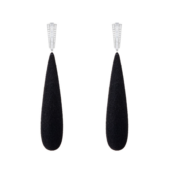 Pendant earrings in black sand and paved with diamonds, in white gold. 130 hours of craftmanship.