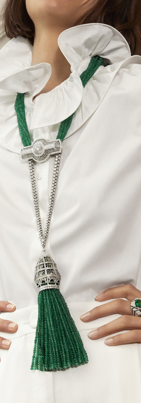 This piece is freely inspired by the dome of the Grand Palais, unexpectedly taken over by vegetation. So, while the bar represents the building seen from above, the top of the tassel in blown glass is just like a real winter garden, housing within it miniature plants in titanium which required unprecedented care and precision to achieve. The body of the tassel is made from emerald beads.