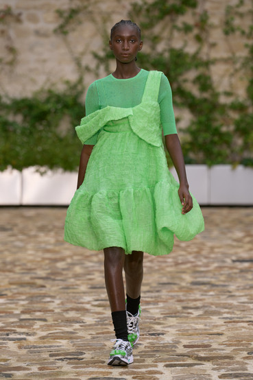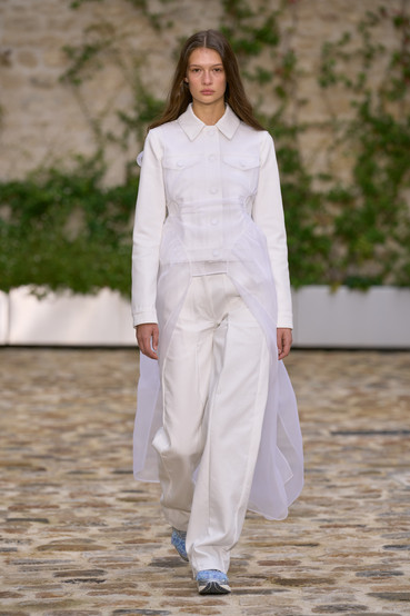 The show, pulled together with longtime collaborator MOON, is held in the simple yet elegant Cour Mansart Monnaie de Paris, a space never before used to host a runway show. Forming the backdrop to the collection is an installation inspired by Yoko Ono. Cecilie commissioned 250 glass bottles from regular collaborator artist and glassblower Nina Nørgaard. Each bottle holds water and refers to all the different people who worked with Cecilie Bahnsen on the Spring Summer 2023 collection and show, whose touch and craft brought this moment to life. A reflection on individuals coming together - of our human connectivity, the idea of oneness through water. The comprehensive soundtrack is composed by another friend of the brand, August Rosenbaum.
