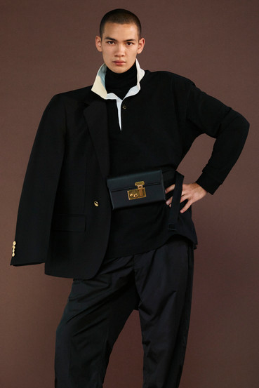 Homey blanket knits in pastel colours become wrap cardigans used for layering. That new era dunhill staple, the wrap tailoredjacket,adds to the sinuous- feel of tailoring in the collection.The undone necktie in crushed satins: becomes a leitmotif, representing a sense oflouche elegance. Grosgrain ribbon strapped derby shoesalsohove a sense of utility and extravagance,a flourish of easy imperfection made of precious- fabrics.