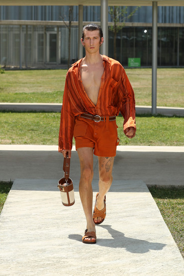The male body is perceived behind the nets, through the perforations of the broderie anglaise that run on t-shirts and shirts, in the transparencies of impalpable materials such as the silks of the caftans, the linens of suits and metalized cottons, under the flow of crushed satins in the tailored suits, in the sensuality of the swimming trunks worn with a shirt. Volumes are soft, and accompany the movement. Shoes with rope soles and sandals seal the idea of lightness. Otherwise, one goes barefoot, to reconnect with the earth, celebrating poetry as a utopia of dolce far niente of utmost importance, tinged with gentle eroticism.