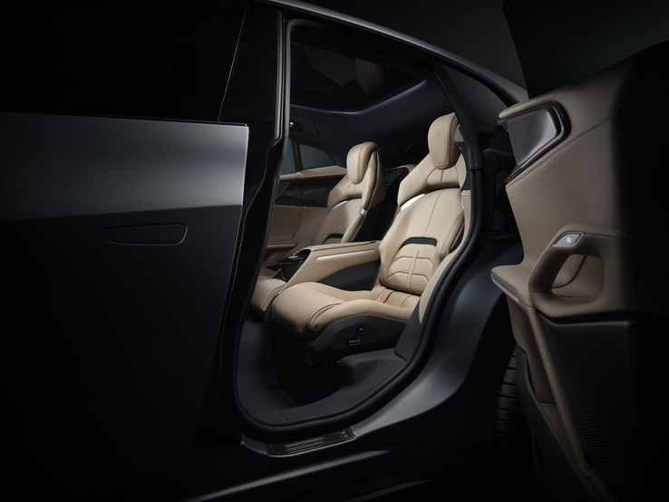 The wraparound forms converge towards the centre embracing the occupants and, through the dialogue between the upholstered volumes and the functional technical areas, underscore the dual cockpit concept both at the front and at the rear. Comfort-related controls are located on a hideaway rotary interface in the central section of the dash, and the rear passengers have access to the same functions via a second rotary interface.