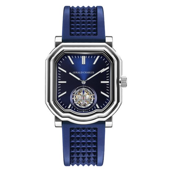 The case: a natural shape for a tourbillon The watch’s form follows that of the now familiar Maestro, immediately recognisable by its playful asymmetrical case with its rippled bezel and “smile” at 6 o’clock. This time, the case is cast in 42mm of medical-grade stainless steel and has a royal blue sunburst dial, a signature Gerald Charles colour. “The smile is such an inviting space to explore and creates a natural playground for a tourbillon,” said Octavio Garcia. “But it also contributes to a paradox: the Maestro’s form and volume make sense to the human eye. And yet when you come to hand-draw it, you realise it has one of the most complex case shapes in watchmaking.