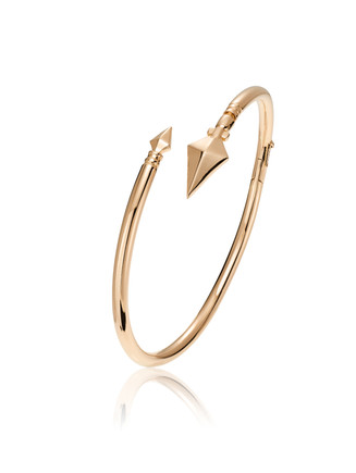 Inspired by the traditional MASAI spear, this bracelet encapsule forever a childhood memory of Sandrine Thibaud, CEO and Creative director: “I was born and raised in Africa and was used to living around the MASAI in my village. I remem- ber being fascinated by their strength, their agility and by the fluidity of their movements. That is what I wanted to recreate in the jewel, by juxtaposing a smooth polished gold surface with the roughness of a sharp pointy tip.