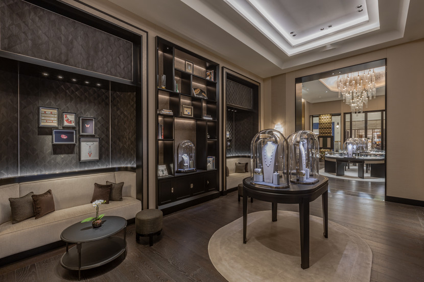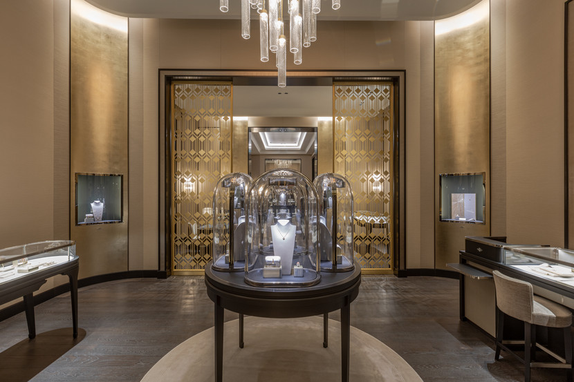 Aiming to offer a high-end experience to visitors, the boutique possesses three exclusive VIP salons, featuring a contemporary furnished living room with an intimate setting. These rooms feature unique Art Deco objects, gouache and table books showing the Maison’s favorite themes. Delicately adorned with elegant details and noble materials, they reflect the octagonal shape of Paris’ Place Vendome, symbolic of Van Cleef & Arpels’ rich patrimony.