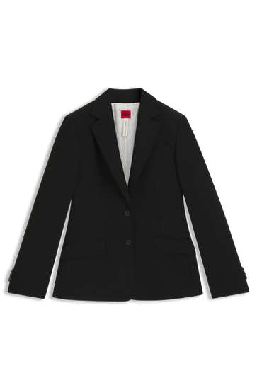 In menswear, the collection's self-starting spirit takes shape through retro "resort" styles filtered through HUGO's modern, metropolitan lens. A boxy double-breasted blazer over a Cuban-collar shirt, with matching pleated trousers and a tortoiseshell tote, is built for days that move from side hustle to late-night meeting without a change of outfit. A long-lined, double-breasted suit in textured weave loosens traditional tailoring to reflect a new kind of ambition: less boardroom, more "build-your-own brief."
