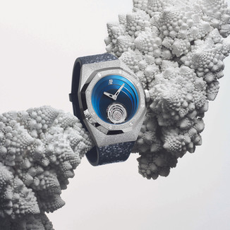 Available in 18-carat pink or white gold, the new Royal Oak Concept Flying Tourbillon combines the case’s shimmering Frosted Gold finish with a contemporary dial composed of multiple layers. For the first time, the Royal Oak Concept’s case is adorned with Frosted Gold—an ancient Florentine jewellery technique revisited by jewellery designer Carolina Bucci and adapted to adorn the Manufacture’s watches. Tiny indentations are created on the gold surface with a diamond-tipped tool, giving a sparkle effect similar to that of precious stones, like diamond dust. Superposed to the bezel’s polished bevels, this finishing highlights the watch’s design codes, while capturing attention from a distance.