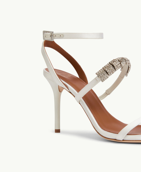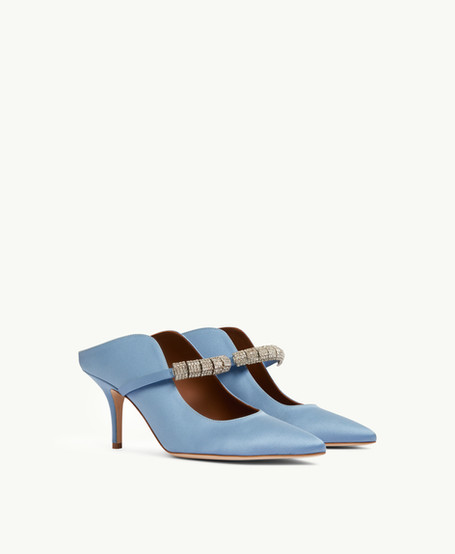 Our familiar, foot-flattering silhouettes take on new guises in a soft palette of blue, cream, and white. Lustrous satins, textural grosgrain, smooth nappa leather, and delicate lace bring each shoe to life. From elegant flats to showstopping stilettos, even the highest-of-high heels combines undeniable beauty with utmost comfort. Every pair features a Malone Souliers signature strap, updated with a string of light-catching crystals.