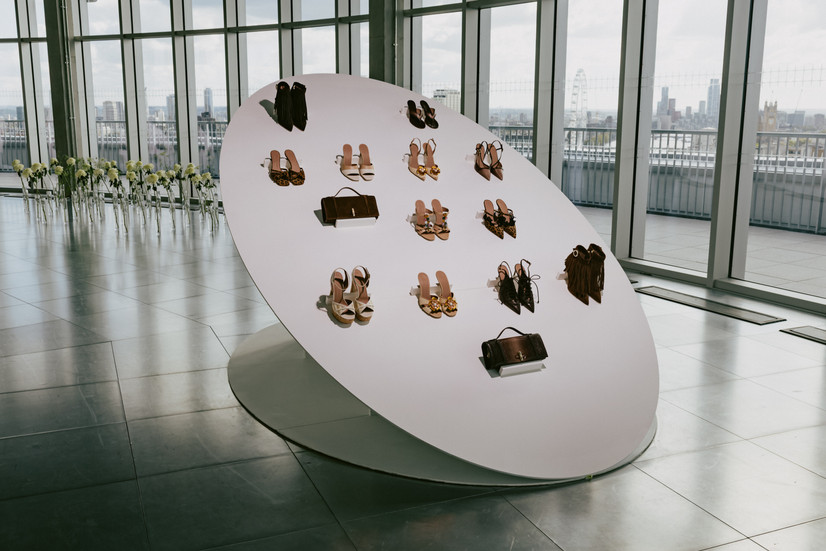 The setting, high on the 17th floor of the iconic brutalist landmark, offered a circular space transformed into a reflective, gallery-like blank canvas with a 360-degree view of London’s skyline. Drawing inspiration from the late 1960s and early 1970s, the SS26 collection channels an era of freedom, playfulness and unapologetic femininity. A floral installation by London-based studio Athlyn, created a meadow-like effect through small clusters of white blooms integrated into the displays, opening a dialogue between structure and organic forms.