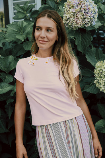 Margherita Maccapani Missoni looked to the MAX&Co. ’90s archives and catalogues for inspiration. The decade’s clean-lined ease is seen throughout. Daisies – ‘Margherita’ in Italian, a tongue-in-cheek nod to the designer’s name – are symbolic of simple pleasures and capture the spirit of the capsule. They are found across the Shall We? collection as embroideries, appliqués and prints.