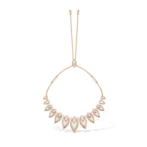 The plastron has also been designed in a mother-of-pearl and turquoise version. Yellow gold is substituted with rose, and deep blue and white mother-of-pearl take the place of malachite. Two further styles which compliment with grace and daring.