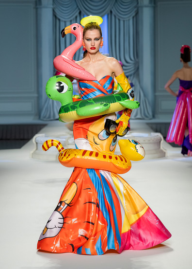 In Moschino’s long-standing manner, each piece in Spring holds some wink or trick of the eye, and is layered with double entendre and wit. The inflatables are genuine or faux, signaling questions between illusion or reality (another conceptual adjunct to the complexity of our era). Ultimately, though, it’s about offsetting the negativity–of breaking through the surface into a ray of sunshine, even when the rest of the water is shadowed in gray. That’s where joy may be found.