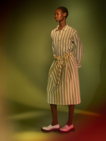 “We selected our fabrics, mixing different scales of checks from ginghams to madras, alongside bold stripes in lime-ivory, pink-ivory and grey-ivory.”