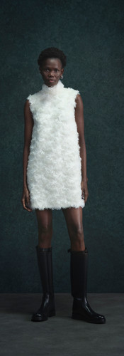 Generously cut coats emphasizing comfort and warmth are cocooned over faux fur knee length shorts. Traditional men’s shirting fabrics are cut into dresses while traditional dress fabrics are cut into shirts. An element of structure takes form of full-circle skirts, funnel neck jackets and sharp tailoring.