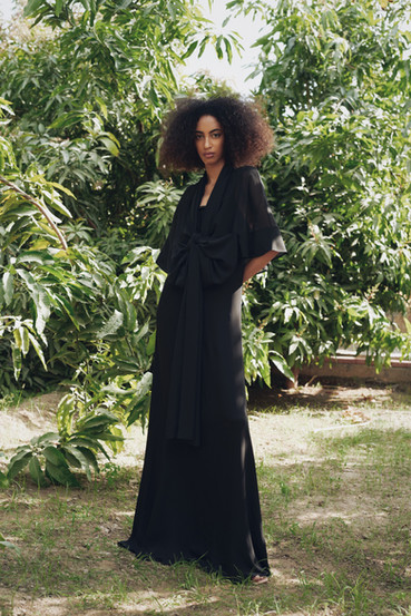 Crafted in Bahrain, the duo reinterpreted iconic silhouettes for the occasion including a long, fluid slip dress worn with a soft pink organza cover up cape, a regal column dress with flowing cape sleeves and high-low hem dress with gathered full sleeve detail.