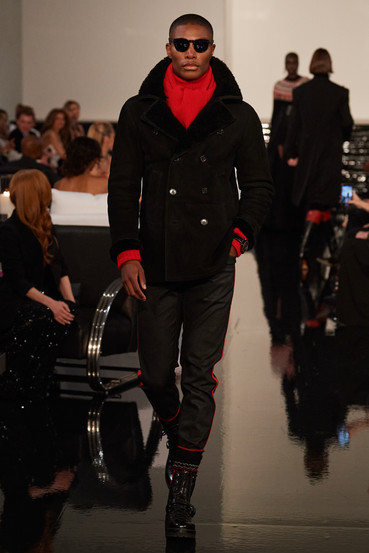Men’s Purple Label echoes the sophisticated sensibility of Collection, with ready-to-wear grounded in the art of black and white dressing. Traditional menswear patterns of glen plaids and pinstripes remain prominent throughout and are made new with fresh pattern on pattern combinations and graphic detailing. Knitwear and outerwear make a strong statement for sumptuous cold-weather dressing with fabrications of cozy Nordic sweaters, a shearling Polo coat, and a red wool Cavalry Riding coat.