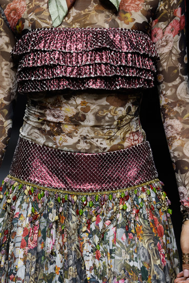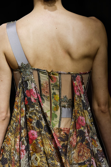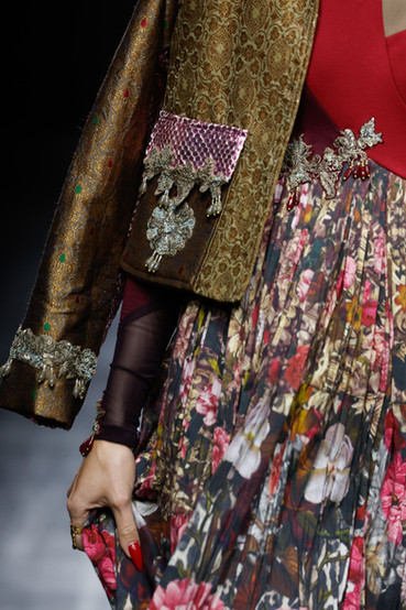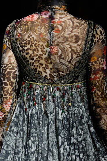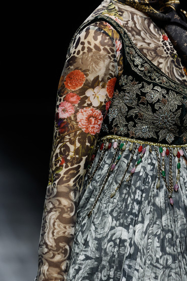 Inspired by the magic of nocturnal blooms, this collection explores the beauty of the unknown, the fleeting and the wild. Rocky Star draws upon the grandeur and allure of florals, capturing their essence in a stunning range of clothing. From the use of refined velvets, delicate tulles, organic muls, each piece in the collection is rooted with Indian embroidery handcrafted with a keen attention to detail. With a focus on silhouette and shape, embracing his baroque aesthetic Rocky Star incorporates ruffles and fabric manipulation techniques to evoke a sense of power. The color palette, influenced by the hues of nature, features deep reds, luminous pinks and modish taupes. Skillfully crafted by artisans, intricate lifelike embroideries along with our signature print creating an ultra-contemporary collection.