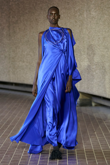 The architectural resident of London’s Barbican, one of Roksanda’s favourite spaces in London, plays host to Spring Summer 2024 show presenting a juxtaposition between its fluid silhouettes and brutalist, utopian architecture. Entering the cemented spaces of structural safety, the iconic Londonian landmark hosts art and design within its sheltering community. A live performance by Isabelle Peters honours this space with beauty and poetry through the soft echoes of music.