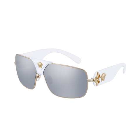 For him and her. This Versace unisex style features a removable leather wrap bridge with a gold-tone Medusa stud. The temples feature a Barocco motif. The model is available in two variations: gold frame with black temples, details and gray lenses, or gold frame with white temples, details and light gray mirror silver lenses.