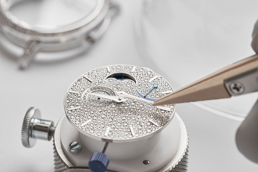 As a means of giving depth to the jewellery aesthetic, the designers chose to enhance the rigorous discipline of prong setting and the effervescence of snow setting with two night blue touches. A tinted mother-of-pearl inlay serves as a 40-hour power-reserve indicator, while the moon phases – standing out on a star-studded disc and in the same gold hue as the case with an opaline finish – appear through an aperture between 8 and 9 o'clock.
